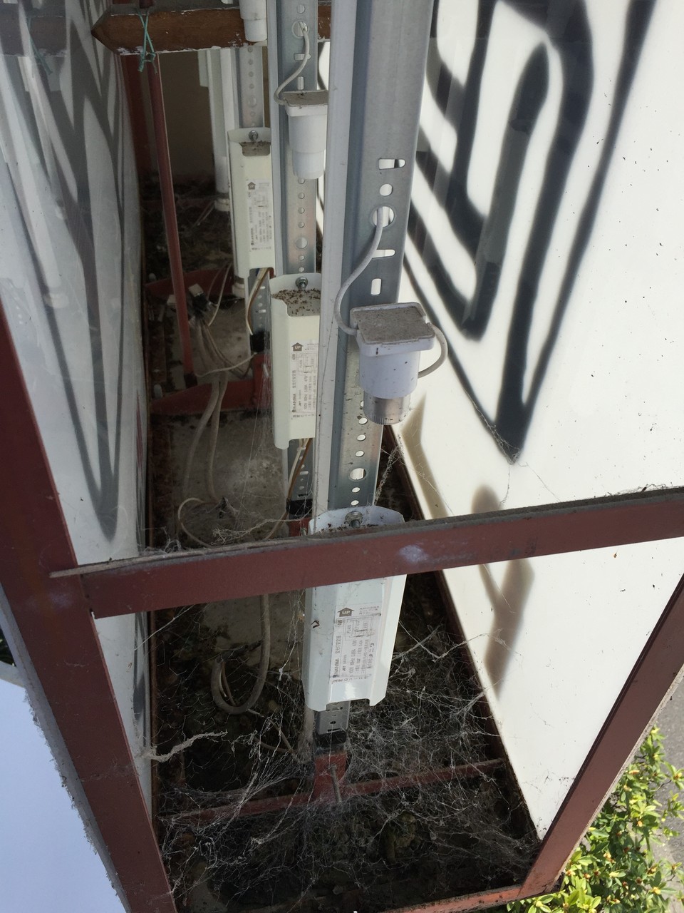 看板内部は、腐敗や雨水の侵入・蜘蛛の巣などで汚れています。